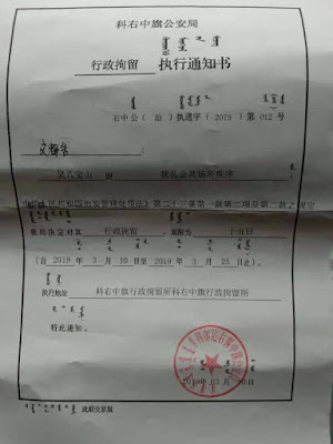 兴安盟科右中旗俩被拘村民的家属也遭警察恐吓不让把拘留通知书外传!